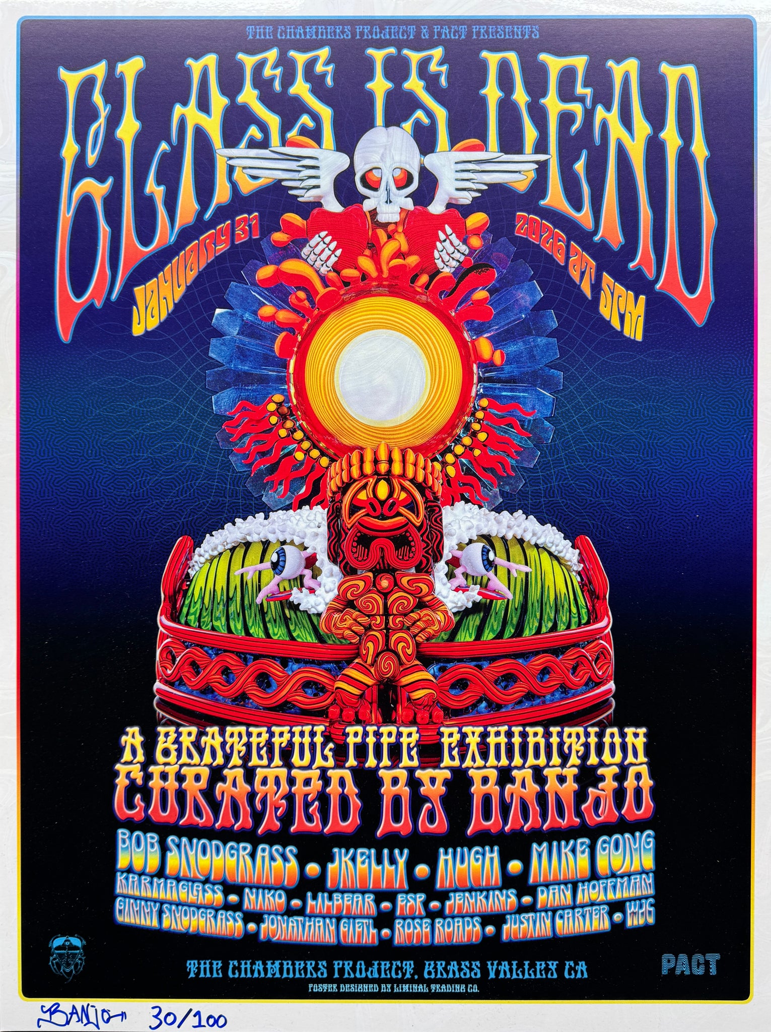 From our iconic "Glass Is Dead: A Grateful Pipe Exhibition" Curated by BANJO event that took place on January 31, 2026. The poster features the EPIC functional glass sculpture BANJO created for our 60 Years Of The Grateful Dead Retrospective that took place on December 6th, 2025. The sculpture was based off of Rick Griffin's iconic "Hawaiian AOXOMOXOA" pen and in drawing, which was also featured in our GD60 exhibition.