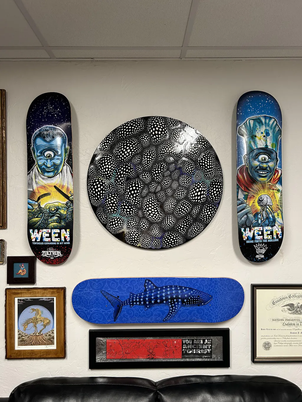 I started working on the concept back in 2010. I was deep in the zone—back-to-back shows, tons of output, and I was building this internal visual language that started to feel more like a living organism than a style. My own alphabet, almost. You do enough painting, it’s like the work starts speaking through you. Shapes, forms, ideas… they emerge from someplace deeper than conscious thought.