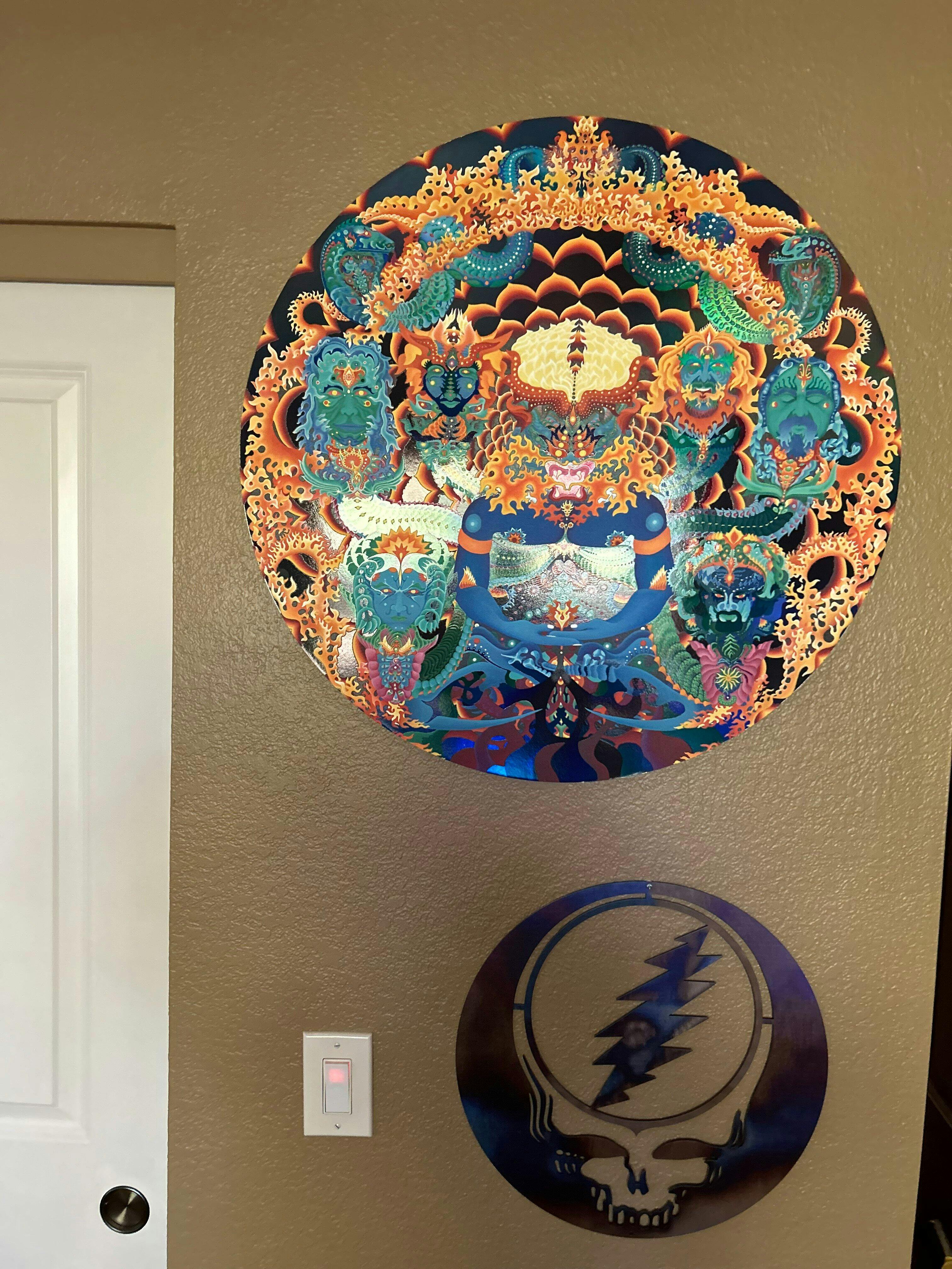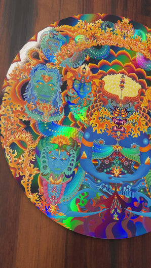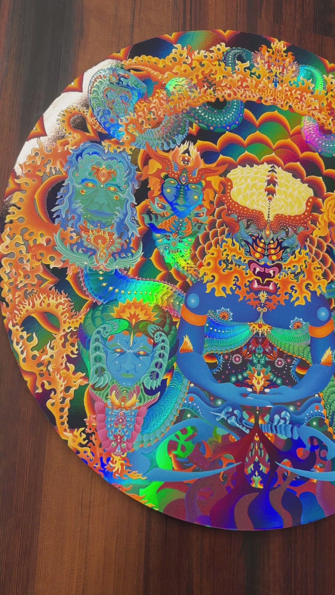 A 27.5-inch die-cut circle, UV printed on holographic-laminated aluminum.